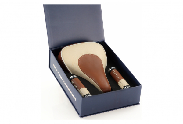 Kit selle et poignées avec Bouchon de guidon / In box / Cuirs de Romans-sur-Isère (France) / Rails Titane / Fait main Ensemble de selle et poignées au montage universel, fabriqué avec des cuirs issus d’une tannerie prestigieuse de Romans (Drôme) ici en trois couleurs crême, marron et brun et trois textures distinctes. La selle est une création originale de United Cruiser. Sa coque composite est pourvue de rails en titane qui lui confèrent resistance et légèreté. Ses dimensions sont de 260 x195mm et son poids est de 330 grammes. Les poignées ont une longueur de 130mm et disposent de deux clamps d’attache pour un maintien parfait.