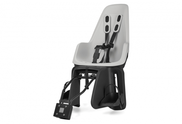 Le porte-bébé arrière Bobike One Maxi blanc se fixe aussi bien sur n’importe quel porte-bagages que sur le tube de la tige de selle grâce au System Click & Go.